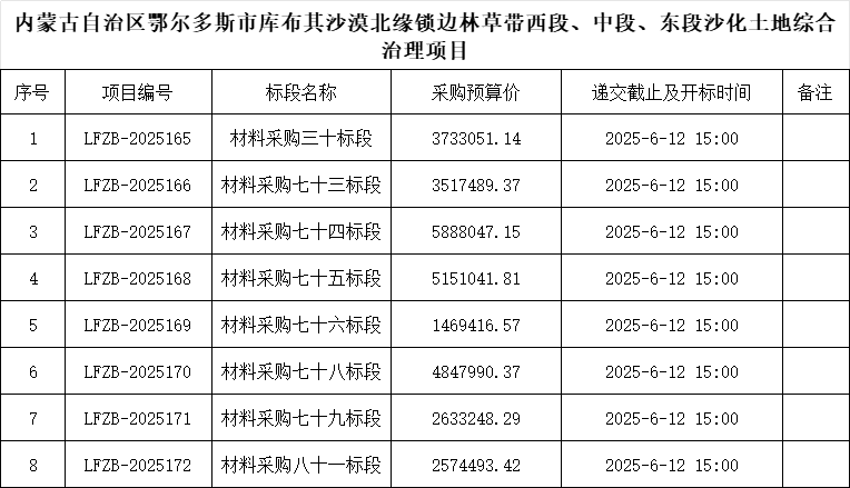 內(nèi)蒙古利凡工程項(xiàng)目管理有限公司受鄂爾多斯市水投惠源建設(shè)有限公司的委托,采用比選的方式,對內(nèi)蒙古自治區(qū)鄂爾多斯市庫布其沙漠北緣鎖邊林草帶西段、中段、東段沙化土地綜合治理項(xiàng)目--材料采購8個(gè)標(biāo)段進(jìn)行采購,歡迎符合資格條件的應(yīng)選人前來參加: