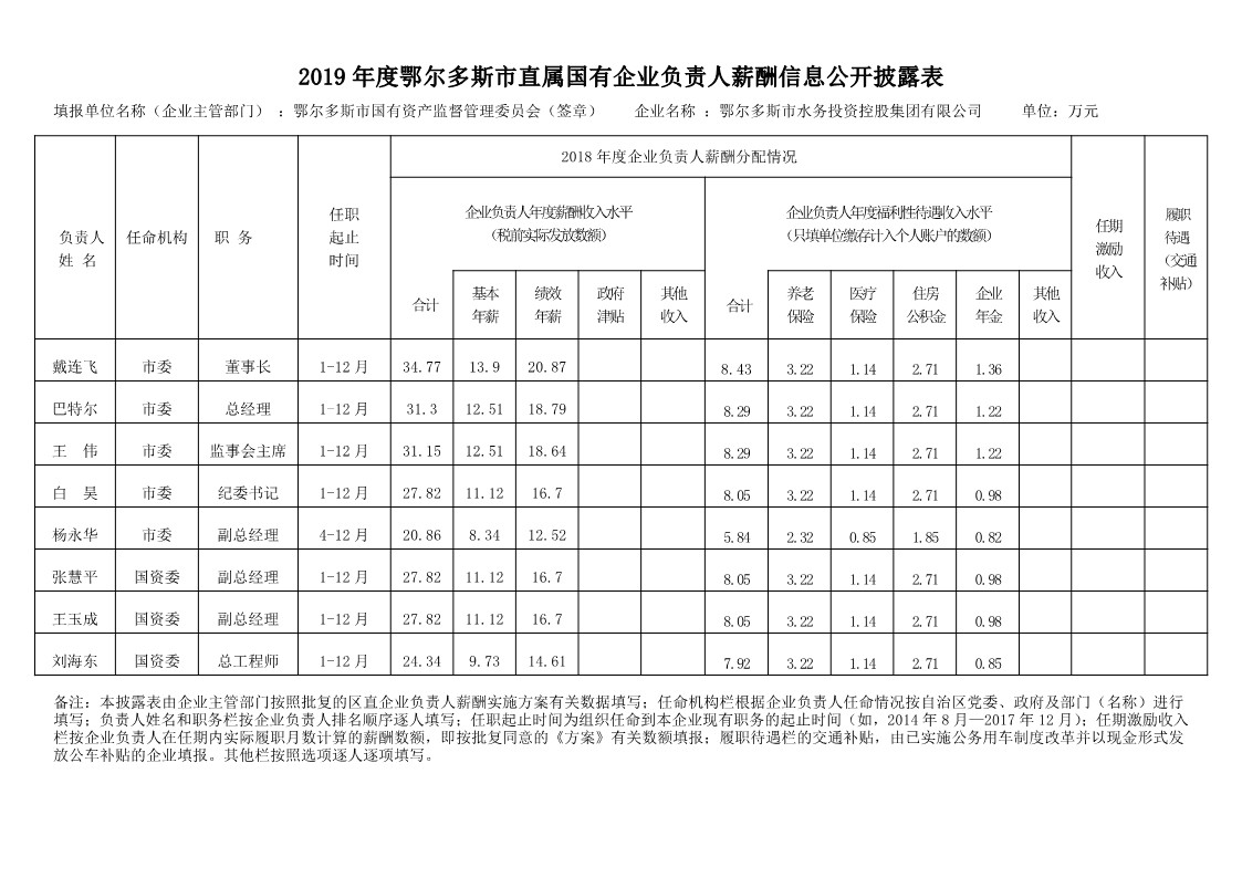 根據(jù)鄂爾多斯市深化國有企業(yè)負(fù)責(zé)人薪酬制度改革工作領(lǐng)導(dǎo)小組(核算委員會)辦公室相關(guān)要求,現(xiàn)將我公司2019年度企業(yè)負(fù)責(zé)人薪酬信息予以公布: