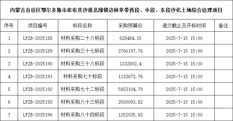 內(nèi)蒙古利凡工程項目管理有限公司受鄂爾多斯市水投惠源建設(shè)有限公司的委托,采用比選的方式,對內(nèi)蒙古自治區(qū)鄂爾多斯市庫布其沙漠北緣鎖邊林草帶西段、中段、東段沙化土地綜合治理項目--材料采購7個標(biāo)段進行采購,歡迎符合資格條件的應(yīng)選人前來參加: