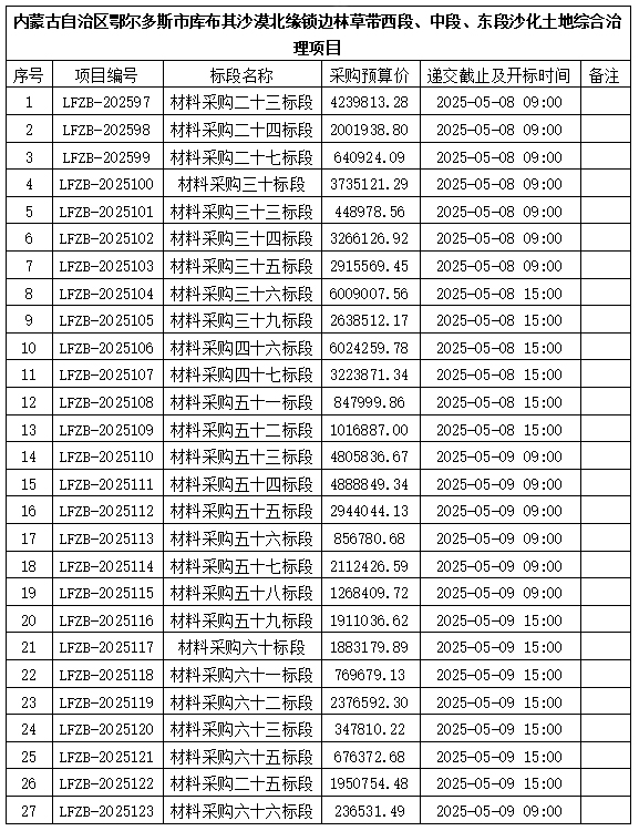 內(nèi)蒙古利凡工程項(xiàng)目管理有限公司受鄂爾多斯市水投惠源建設(shè)有限公司的委托,采用比選的方式,對(duì)內(nèi)蒙古自治區(qū)鄂爾多斯市庫(kù)布其沙漠北緣鎖邊林草帶西段、中段、東段沙化土地綜合治理項(xiàng)目--材料采購(gòu)27個(gè)標(biāo)段進(jìn)行采購(gòu),歡迎符合資格條件的應(yīng)選人前來參加: