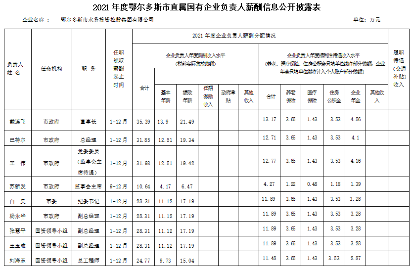 備注:本披露表由企業(yè)主管部門按照批復的區(qū)直企業(yè)負責人薪酬實施方案有關數(shù)據(jù)填寫;任命機構欄根據(jù)企業(yè)負責人任命情況按自治區(qū)黨委、政府及部門(名稱)進行填寫;負責人姓名和職務欄按企業(yè)負責人排名順序逐人填寫;任職領取薪酬起止時間為組織任命到本企業(yè)本年度領取企業(yè)負責人薪酬的起止時間;養(yǎng)老保險和醫(yī)療保險單位繳存數(shù)額對應個人繳存基數(shù)和按照單位繳費比例確定;履職待遇欄的交通補貼,由已實施公務用車制度改革并以現(xiàn)金形式發(fā)放公車補貼的企業(yè)填報;其他欄按照選項逐人逐項填寫。